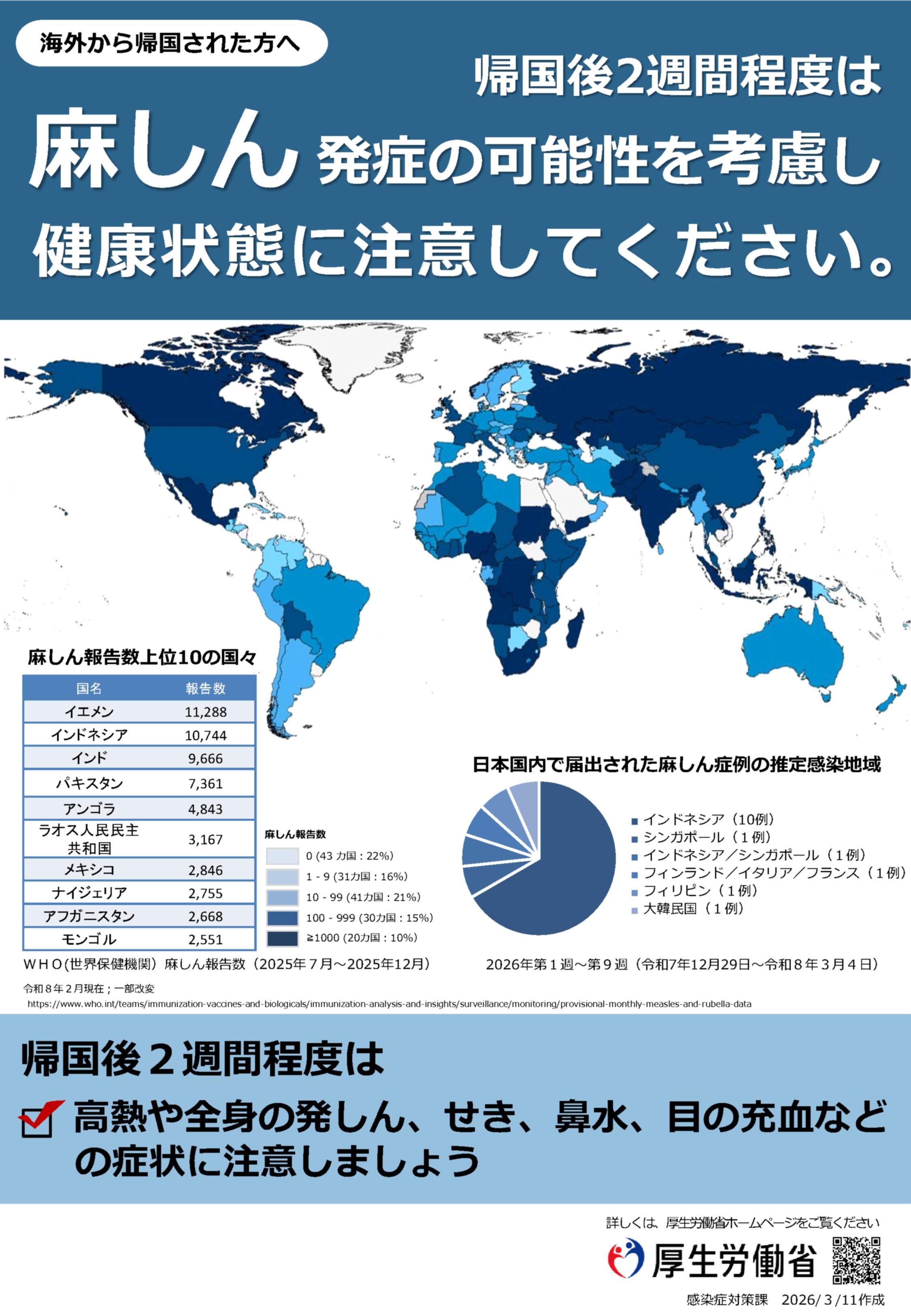 ・麻しん発生報告数の増加に伴う注意喚起について(協力依頼)(令和8年2月13日付事務連絡)